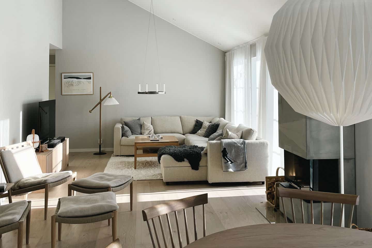 Kök och vardagsrum är placerade i fil längs ena långsidan i en öppen planlösning, med högt i tak och stora fönsterpartier som ger bred utsikt och ett naturligt ljusinsläpp.