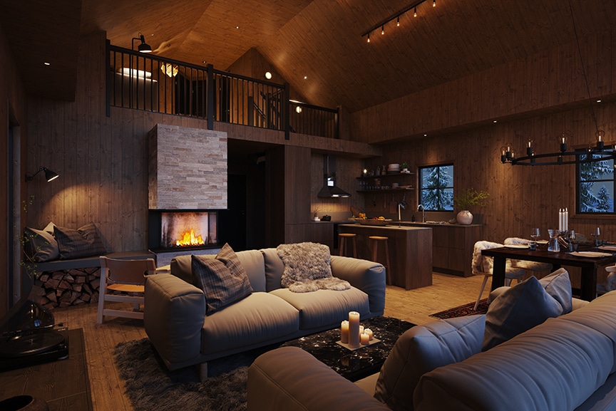 Lofthuset med extra allt! Upp till nio bäddar, bastu med egen utgång, och två WC. Praktisk hall med en liten WC och skidförråd/teknikrum med egen ingång utifrån. Ljusinsläppet genom de stora fönsterpartierna i kök/storstuga är magiskt, och den invändiga takhöjden på nästan fem meter ger mäktig rymd.