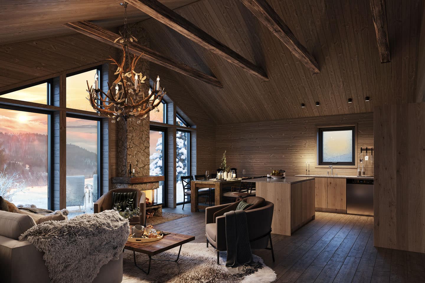 De större modellerna i Sylarna-serien är anpassade för större familjer eller sällskap och kan rymma upp till fyra sovrum samt två badrum med dusch. Kök och storstuga bildar en gemensam yta för umgänge, med högt i tak och synliga hanbjälkar som förstärker känslan av rymd och ljus.