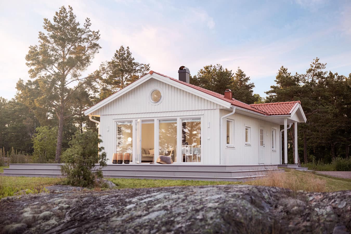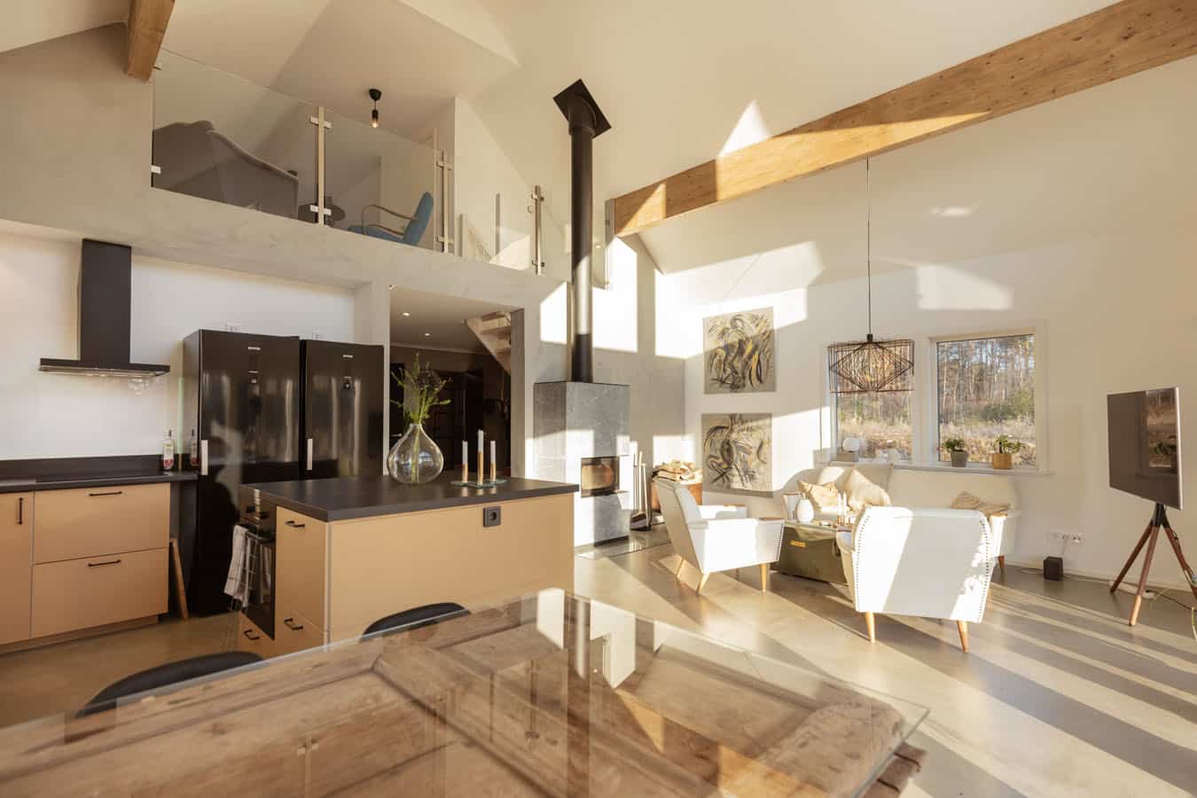 Agö har vardagsrum på gaveln med olika typer av fönsterpartier beroende på takvinkel. Ryggåstak eller synliga hanbjälkar ger högt i tak i kök och vardagsrum, skapar rymd och en luftig bostadsmiljö.