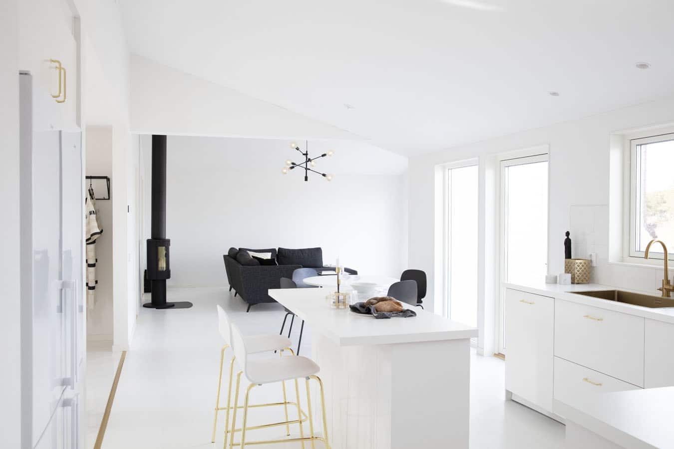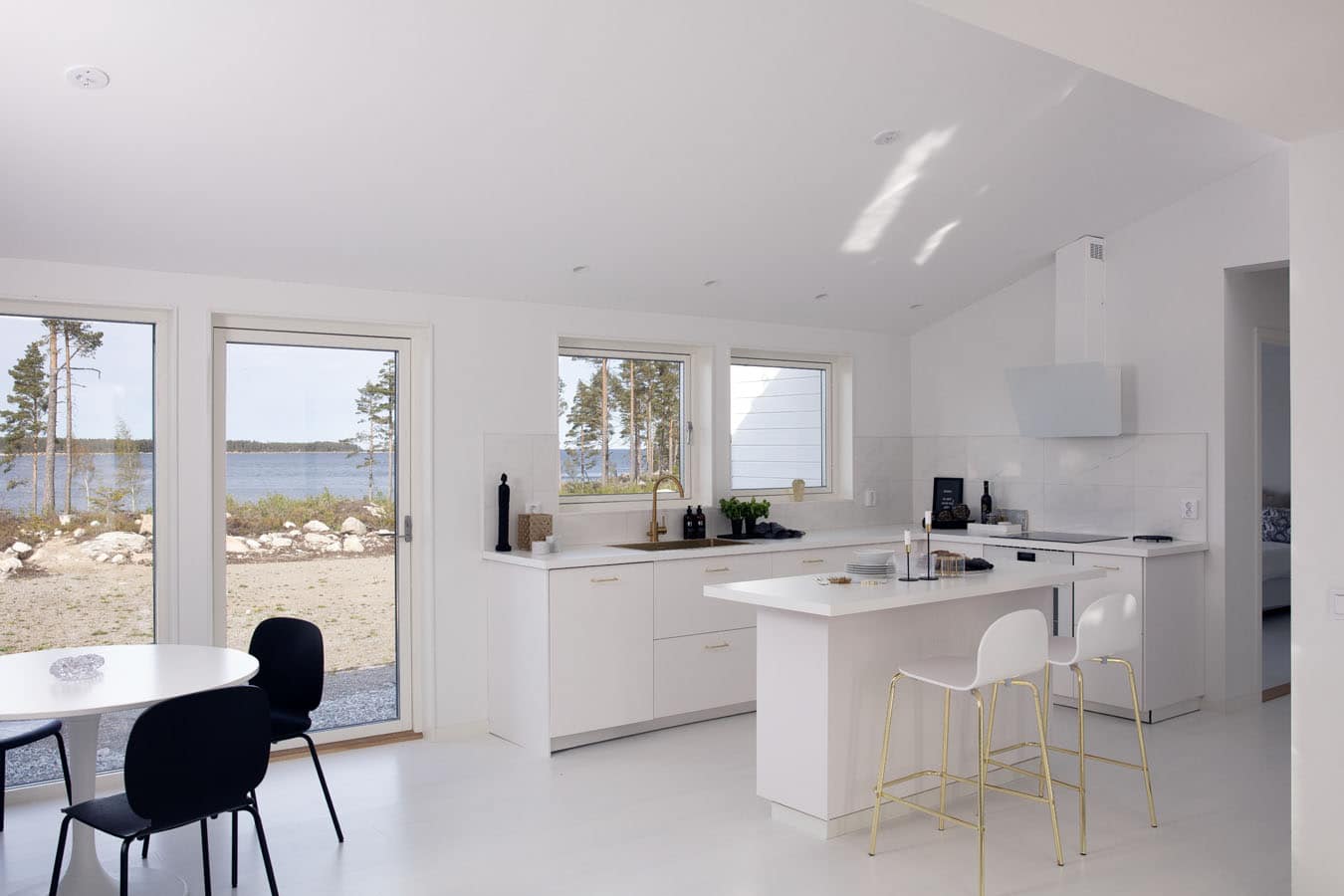 I den centrala delen av huset är kök och vardagsrum samlade i en öppen planlösning som utgör husets gemensamma kärna. Stora fönsterpartier ger ett naturligt ljusinsläpp och skapar god kontakt med utemiljön, samtidigt som planlösningen möjliggör avskildhet i de båda flyglarna.
